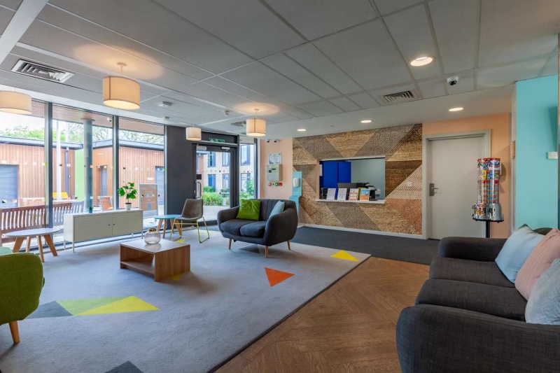 - The Hub includes a reception area, a spacious study room, a comfortable TV area, and regular events throughout the year.