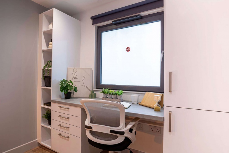 Our Deluxe Studios, located on the 7th floor, provide 17.5m2 of well-designed space. Each studio features a double bed, private en-suite bathroom, fully fitted kitchenette, ample storage, and a dedicated study area. With all-inclusive bills and Wi-Fi, you can enjoy a comfortable and connected student life. All students also have insurance cover, through Howden for Students.