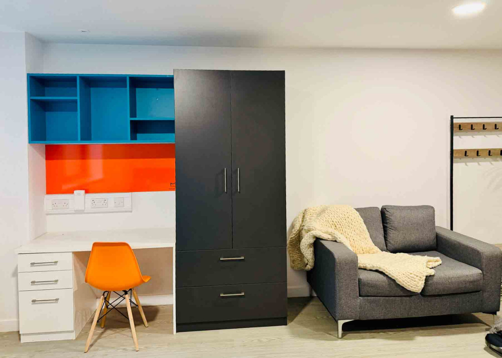 - All rooms fully furnished with small double bed (4ft), study desk, wardrobe and storage