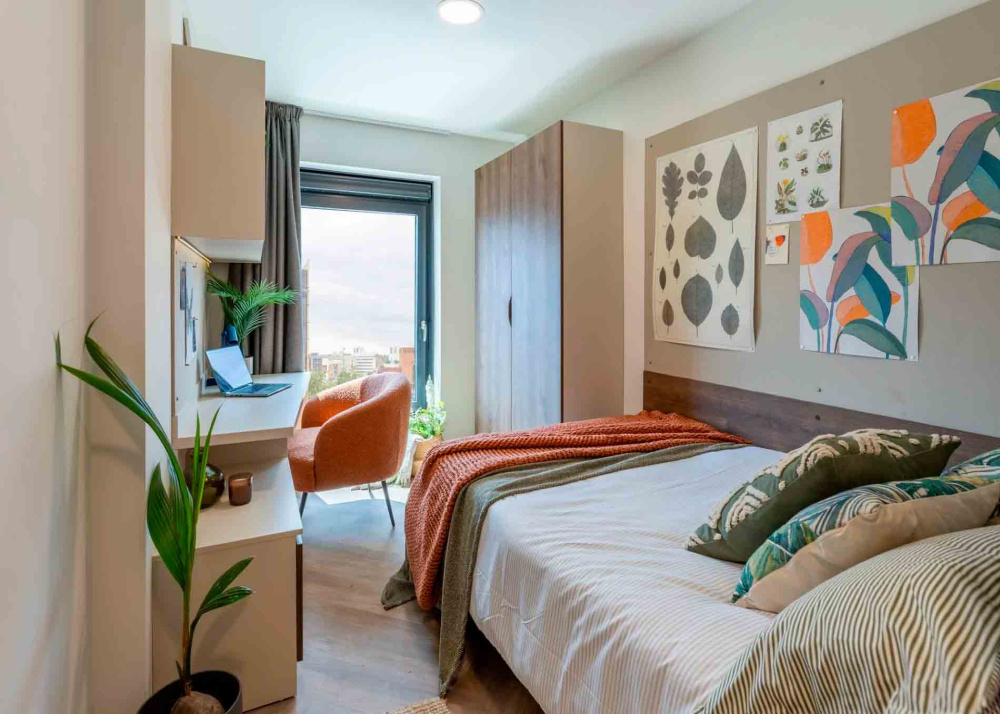 Experience Luxury Student Living in our Gold Studios, available on floors 6 to 10. These studios range from 20.1 to 20.2 square meters and come fully furnished. Each studio features a private washroom with storage, a small double bed with under-bed storage, a desk, a shelf above the desk, a wardrobe, a chair, a full-length mirror, black out curtains, and amenities like an oven, fridge freezer, hob and seated area so you can eat separately to studying! It’s an ideal space for students who want both functionality and style. Book your studio today so you don’t miss out!