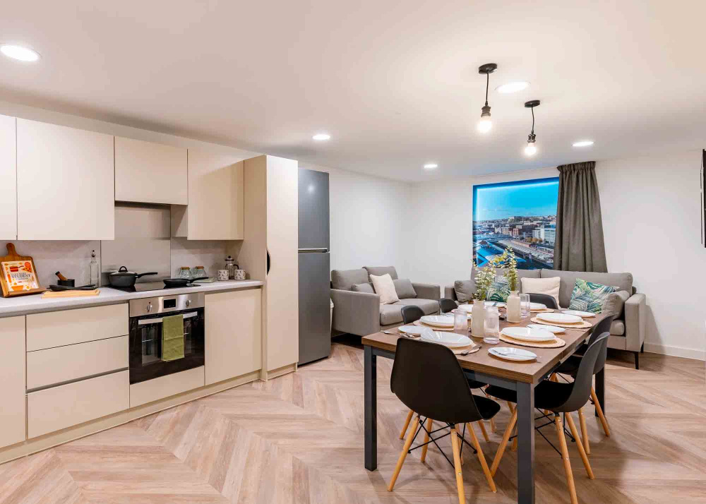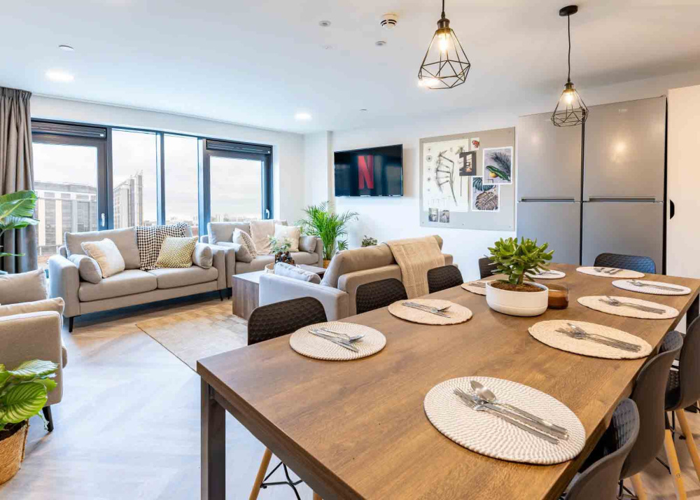 It has large communal spaces where you can cook, watch Tv and interact with your flatmates. Book your room today!
