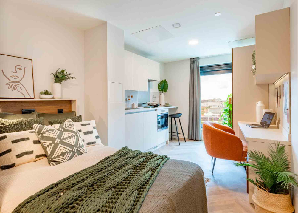 Self-contained studios with private kitchen and bathroom, ranging from Bronze to Platinum specification. Gold studios are available on 45-week and 51-week tenancies; all other studio tiers on 51-week tenancies. An accessible studio is also available on request.