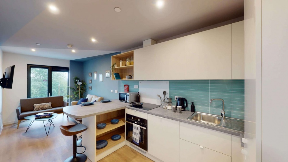 Get ready to relax in your comfy double bed after a long day at university and appreciate plenty of space with wardrobes, shelving, and desk area! All Studio Premium Plus rooms come with accessible bathrooms giving you plenty of space. Your brand new apartment is furnished with a private ensuite bathroom and a modern kitchen with top quality facilities, perfect for learning the art of cooking.