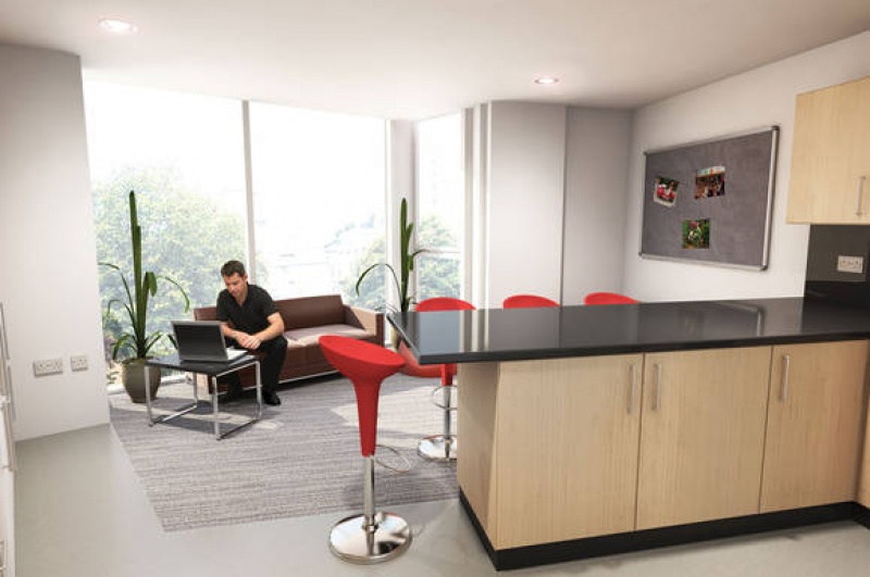 - Shared cluster kitchens with oven, hob, fridge freezer, and dining areas