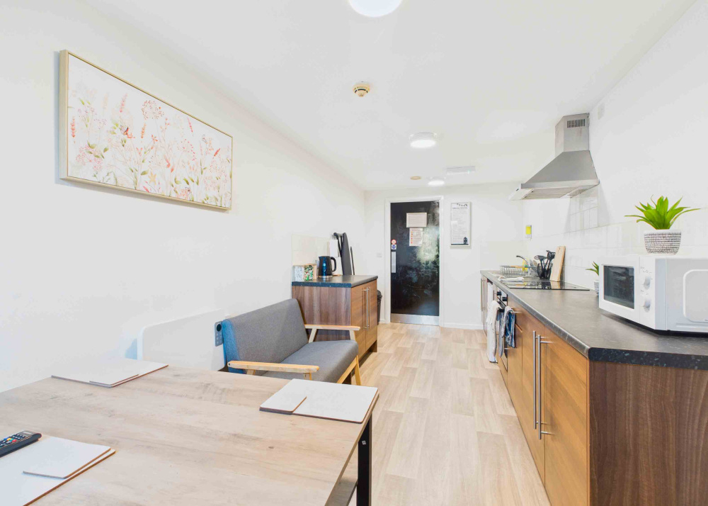 - Shared kitchen per flat (oven and hob, large fridge freezer, microwave, dishwasher, kettle and toaster)