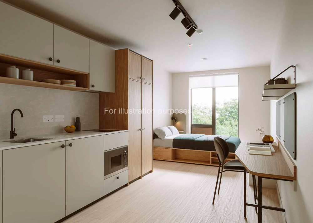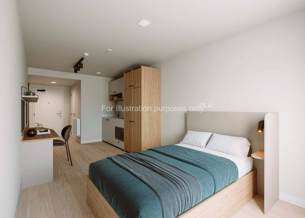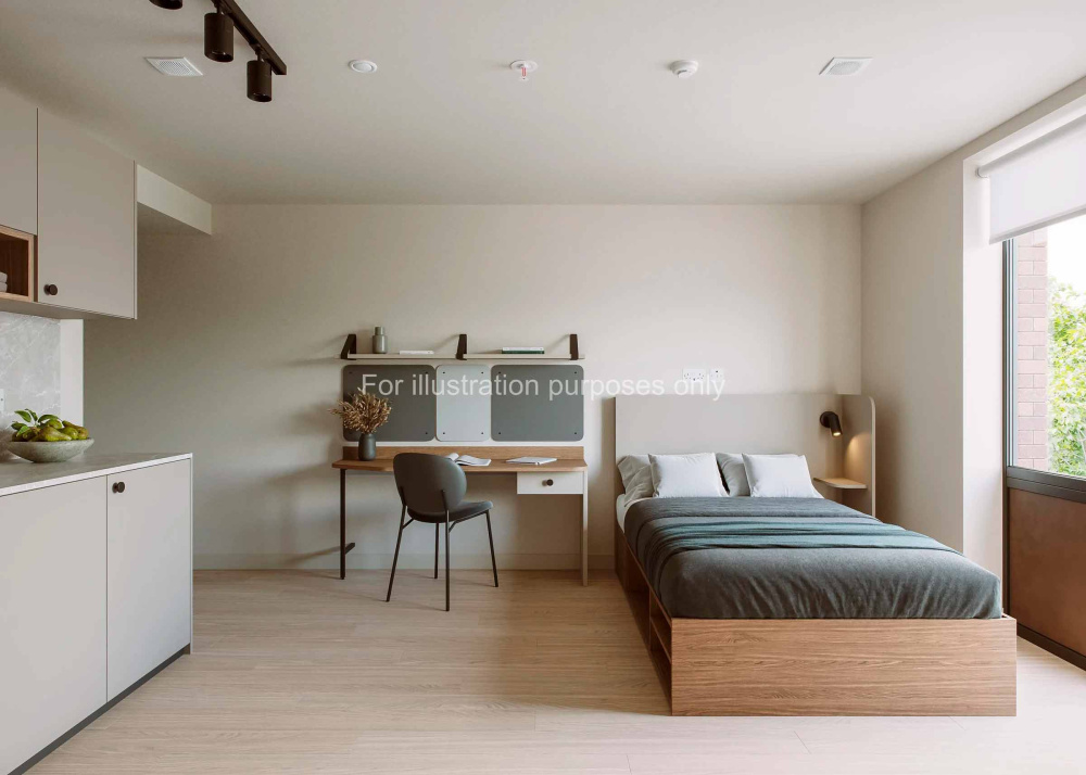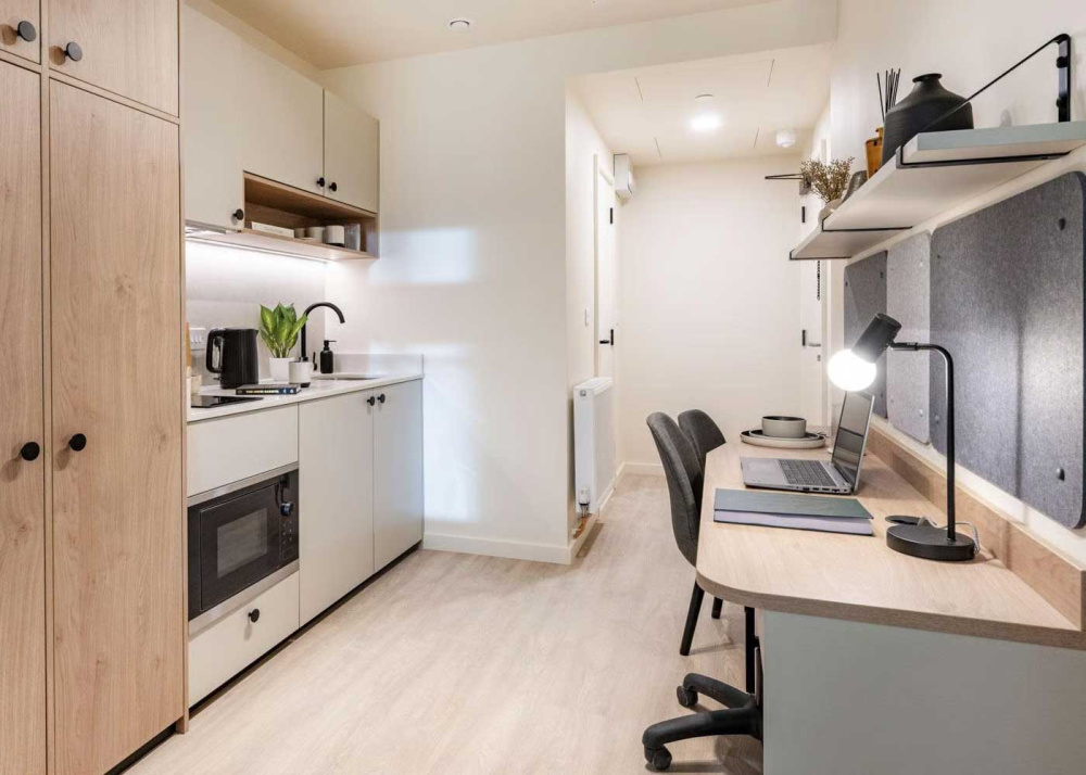 Studio rooms offer a fully self-contained space with a private bathroom, kitchen and study area, suitable for students who prefer greater independence.