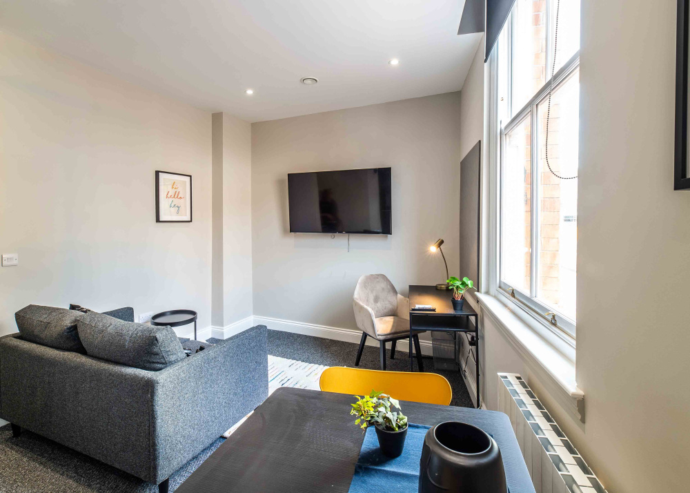 Canning Place offers studio apartments and larger two and three-bedroom apartments, all individually designed and finished to a high specification. Every apartment features a double bed, wall-mounted Smart TV, fully equipped kitchen and a private bathroom with rainfall shower. Large Victorian sash windows provide generous natural light throughout.