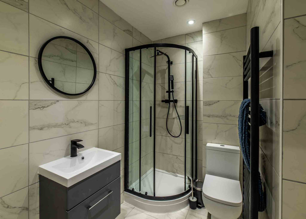 Self-contained studios with a private fitted kitchen — including washer-dryer, dishwasher, oven, electric hob and fridge-freezer — and a private bathroom with rainfall shower. Designed for students who prefer independent living in a calm, contemporary space.