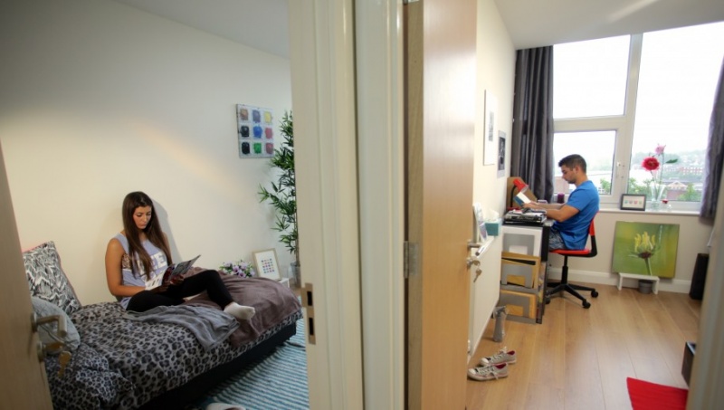 The two bedroom apartments are much sought after and are geared more towards friends sharing who would also like their own space and privacy. At an impressive 27 square metres, this deluxe flat has four rooms in total, comprising two bedrooms, a bathroom and a kitchen. Each bedroom features a 4ft bed, desk, wardrobe and curtains. The kitchen has a sleek, contemporary breakfast bar and is already furnished with a kettle, toaster, microwave, fridge and 2 ring hob. The bathroom is modern with a WC, sink and shower. As with all rooms at Apex Heights, there is super fast WiFi/internet, a telephone in each bedroom and free inter-room calls. Remember, all prices include your weekly rent and bills* in one easy price. |