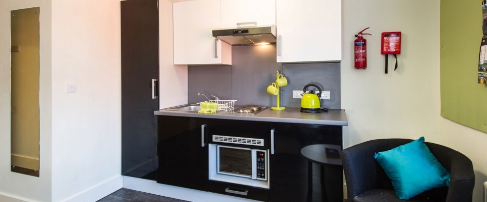 - Each studio features a private en-suite shower room, a comfortable double bed, a storage and study area, and a modern cooking area with a breakfast bar for dining.