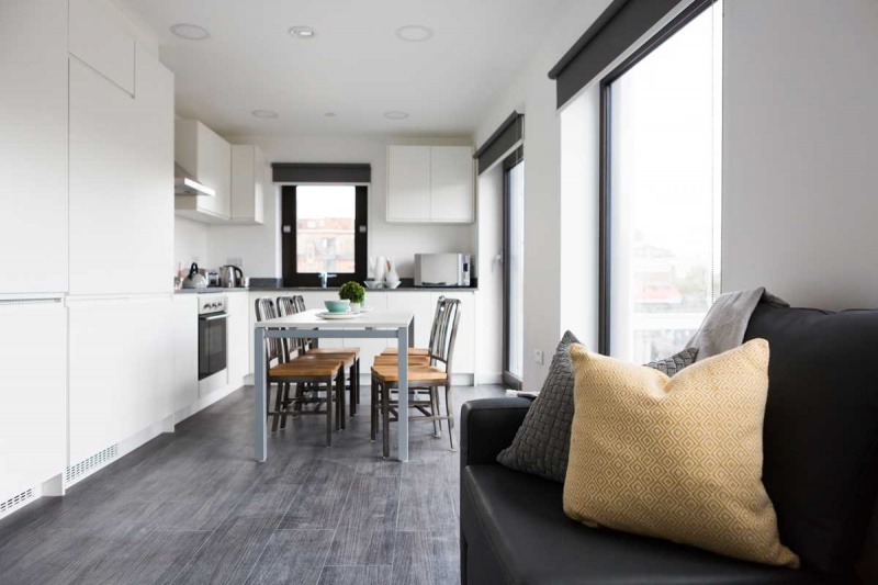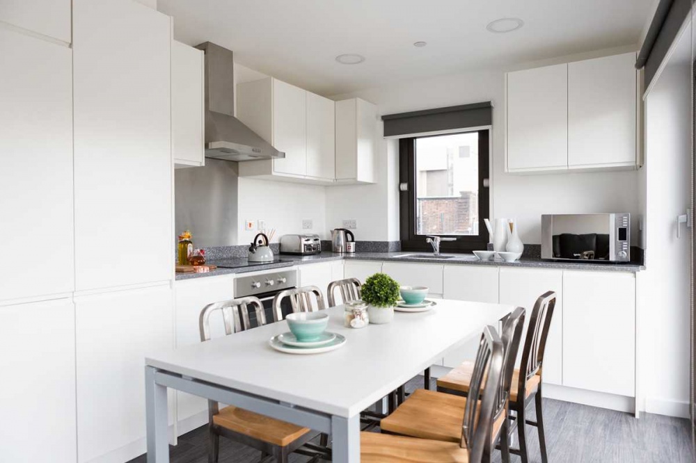 Our students share a kitchen with 3 or 4 other IH students. Each kitchen has a hob, kettle and microwave and a kitchen pack is provided within the fee, which gives you all the kitchen utensils you will require during your stay.