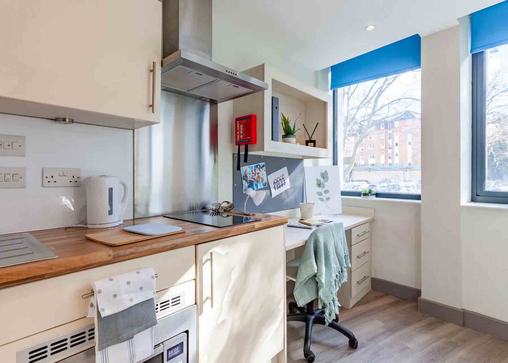 Your all-inclusive ensuite room has everything you need to study and socialise comfortably. We have a number of different light and airy studios with three large windows to select from each giving you different views of the city. With each room containing a 3/4 sized double bed, study area with desk, chair and loads of storage space this gives you loads of space to hang out. The kitchenette comes fully equipped with hob, oven and under-counter fridge/freezer with a breakfast bar to socialise around. Each room has its own good sized ensuite shower room.