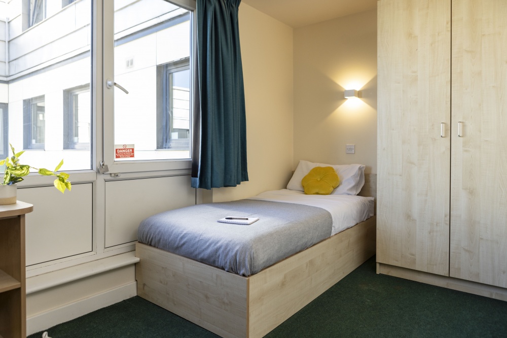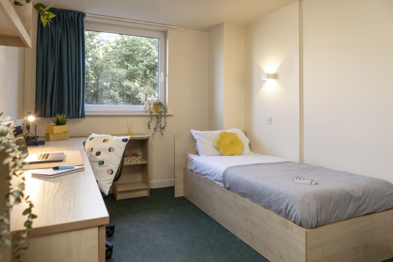 When you come to university in Leeds, you'll see that your Bronze Room is comfortable and bright, with an en-suite bathroom and lots of floor space; whether you're having a movie night with friends or you're teaching yourself yoga. These bedrooms also come with shelves, drawers and a handy bookcase for all your notes and textbooks, as well as a spacious wardrobe. |